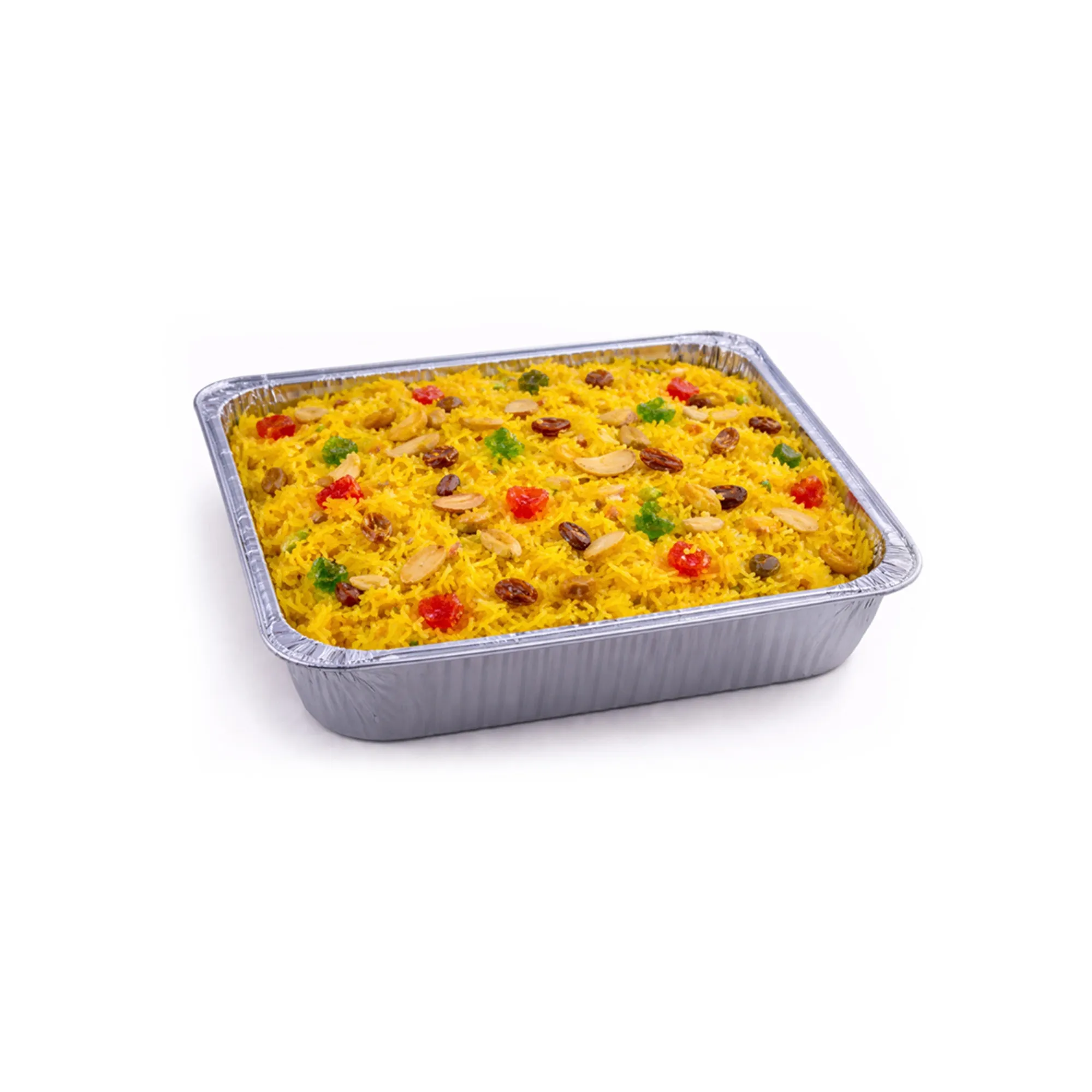 Sweet saffron-infused rice prepared with sugar, nuts, and colorful candied fruits.